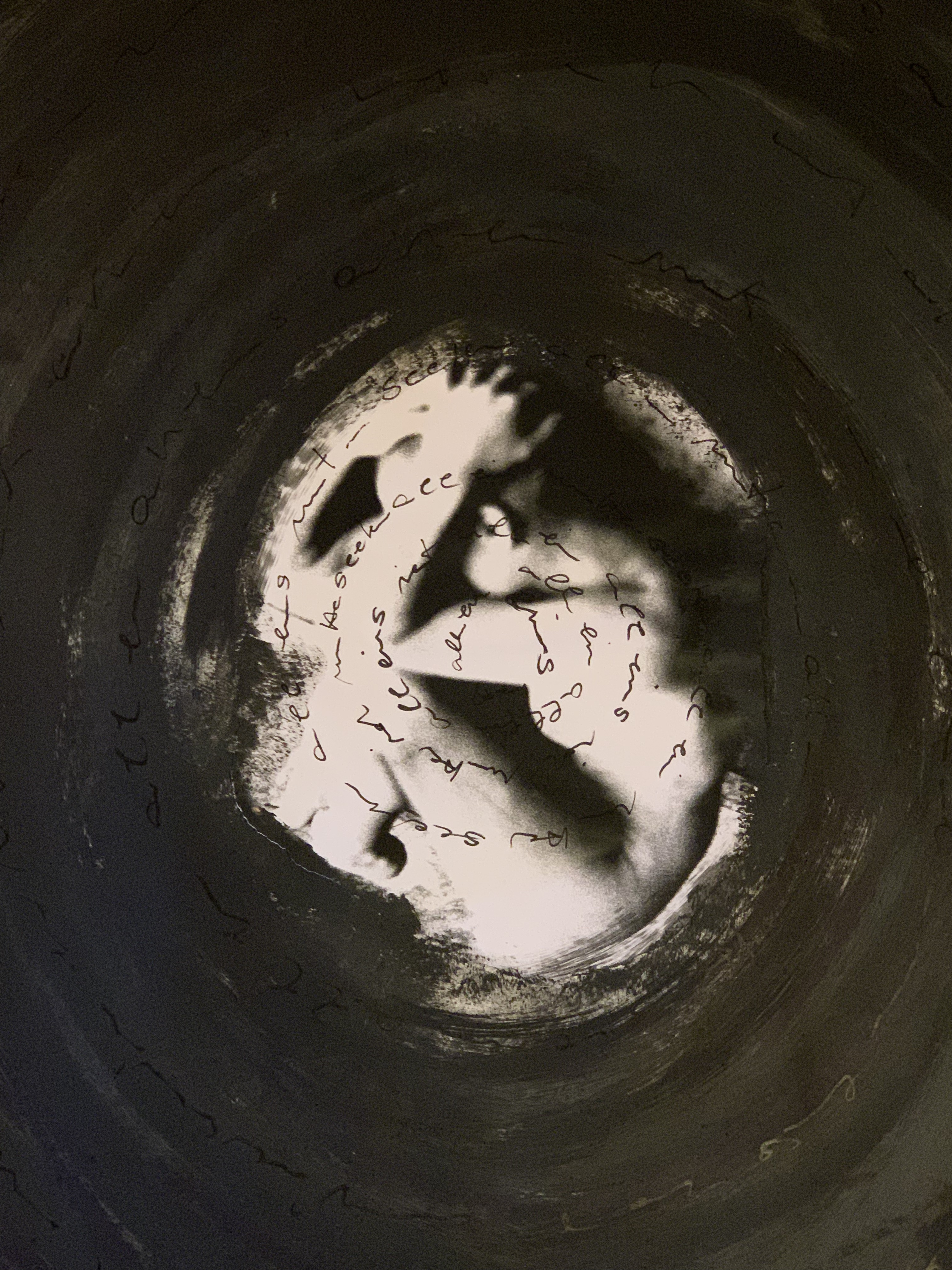 Eine Kopie davon in der Mitte eines 70×100 Karton platziert, alle schwarze Farbe die ich da hatte (unterschiedliche Farrow&Balls-Töne, Lack …) um mich herumgestellt. Und Los: Kreisen, einer nach dem anderen, kraftvoll und schwer, der embryonale Form einen Halt geben, sie begrenzen, einhüllen … die Grenzen auflösen, verwischen, verschmelzen in einem warmen tiefen Schwarz. Die Unendlichkeit eines warmen Schwarzes war mir schon immer Trost. Ich erinnere mich wie mein Körper sich anfühlte, wie gut mir diese Körperliche im Malen gefiel, dieses mich als Körper wahrnehmen und mich gleichzeitig zu vergessen. Im Kreisen. Im Tun.